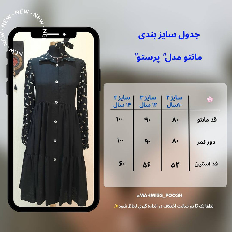 مانتو پیراهنی مهمیس مدل پرستو ، مناسب ۱۰ و ۱۲ سال در ۴ رنگ مشکی و آبی آسمانی و کالباس و نسکافه ای ، (جنس رنگ مشکی بابوس می باشد) ، بدون چروکی و آبرفت ، جلو دکمه خور ، مزون دوز ، مچ کشی