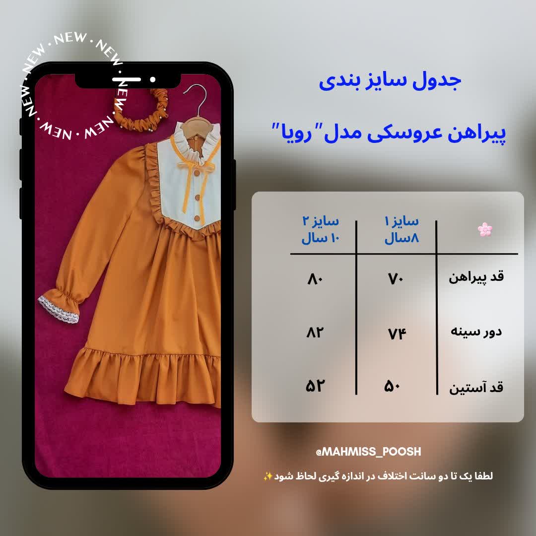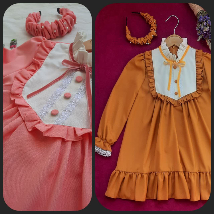 پیراهن عروسکی دخترانه مدل رویا در ۴ رنگ سرمه ای و هلویی و گلبهی و خردلی تهیه شده که در حال حاضر دو رنگ خردلی و گلبهی در سایز ۱ موجود است .