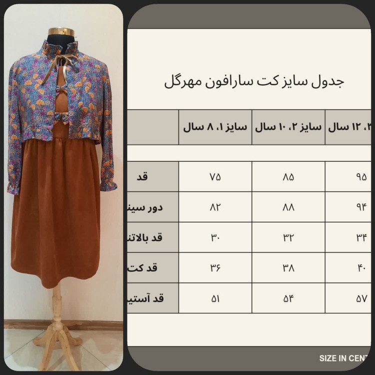 کت سارافون مهرگل در ۳ سایز ۸ و ۱۰ و ۱۲ سال می باشد . جنس سارافون مخمل کبریتی ریز درجه یک بدون چروکی و جنس کت لینن کرکی آبرفت گرفته شده می باشد .