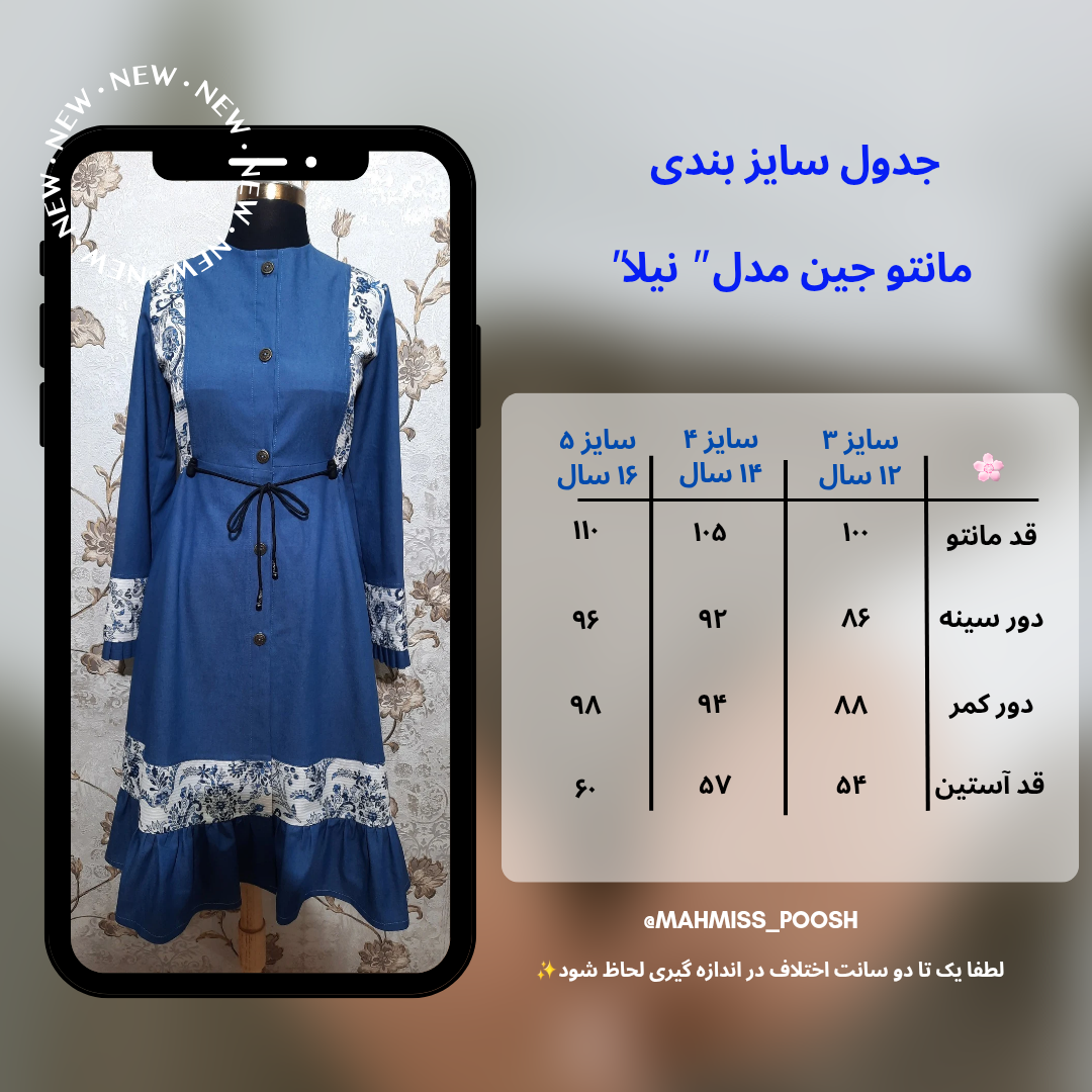 مانتو جین کاغذی دخترانه مدل نیلا در ۳ سایز و مناسب ۱۲ تا ۱۶ سال و یا سایز های ۳۴ تا ۴۰ می باشد.