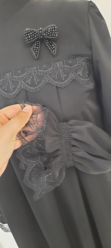 در برش کارور جلو و پشت پیلی دارد و روی درز تور ارگانزا دوخته شده.